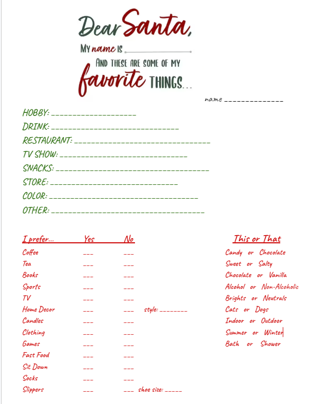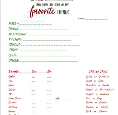 A colleague suggested a Secret Santa gift exchange. It was well received by all and we were super excited to share our creative shopping experience with our person. Unfortunately, many of us didn't know enough about the person that we drew and were struggling to conceptualize a great experience. This form was created to assist the secret shopper with the best shopping experience.